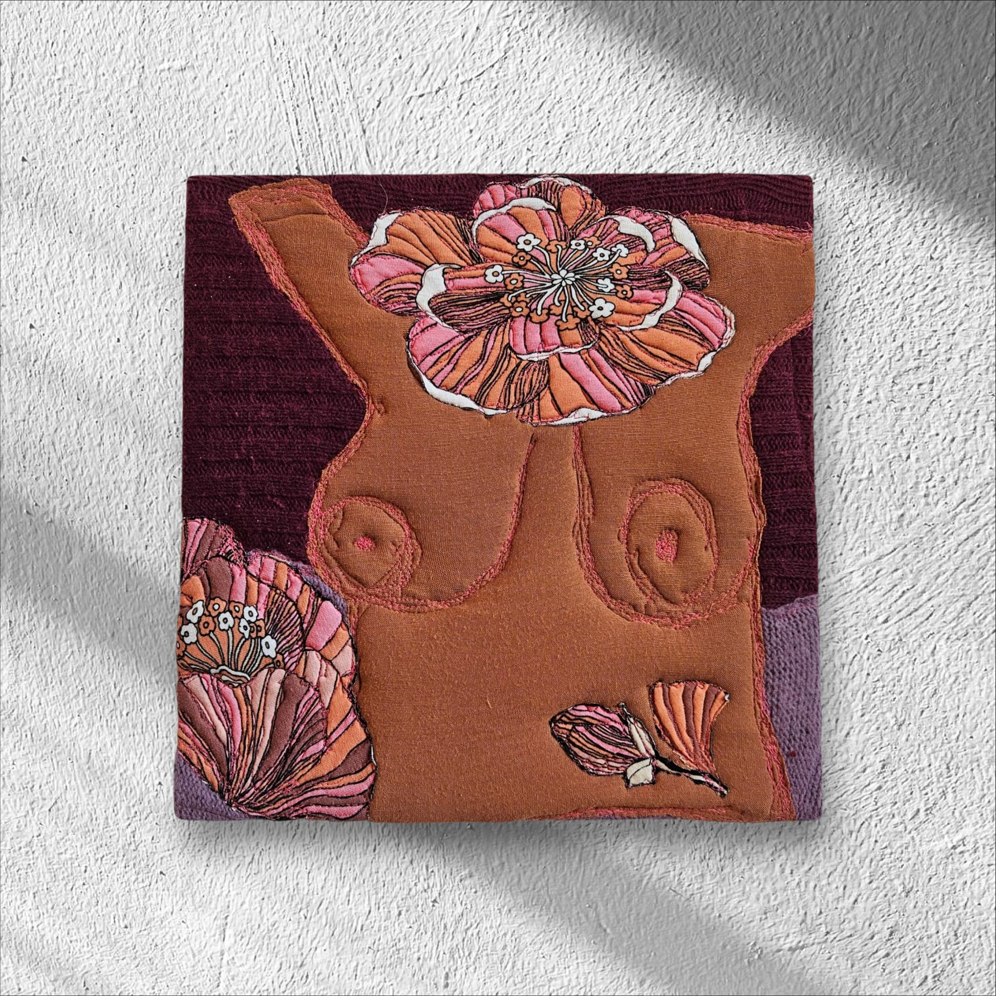 This series of works combines painting on canvas with fabrics, embroidery, and patchwork. I thrive on exploring different types of fabrics and blending new and traditional techniques. Inspired by my previous photography projects, this series celebrates the beauty of the female body.