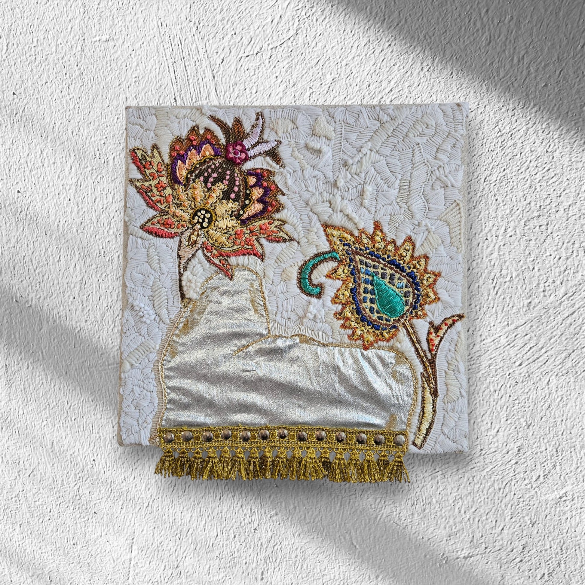This series of works combines painting on canvas with fabrics, embroidery, and patchwork. I thrive on exploring different types of fabrics and blending new and traditional techniques. Inspired by my previous photography projects, this series celebrates the beauty of the female body.