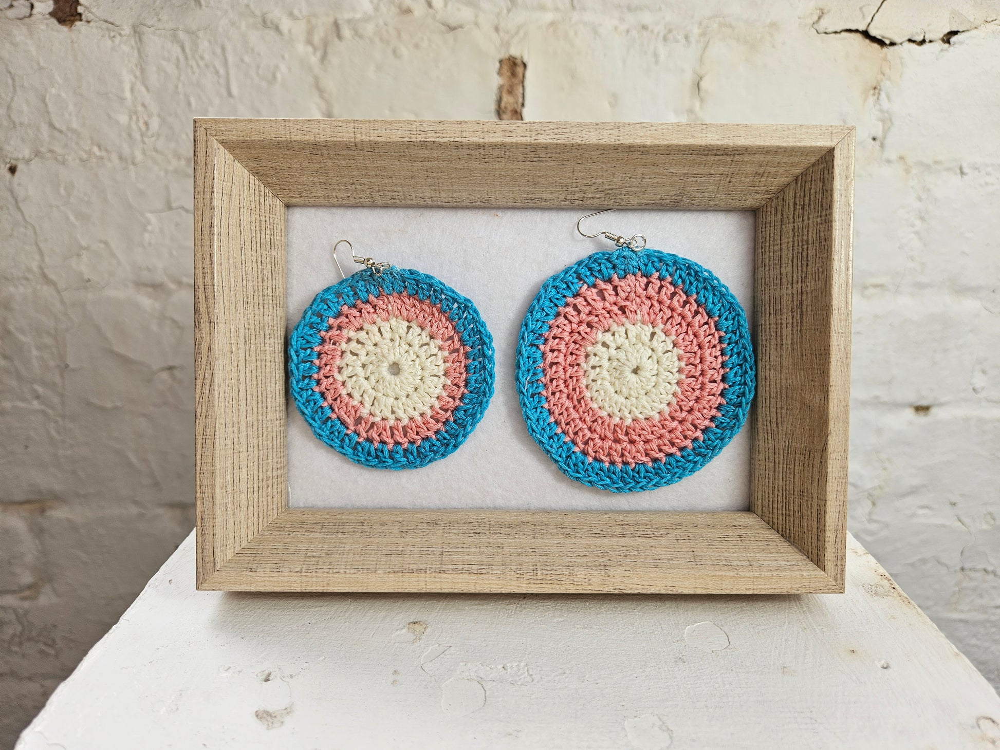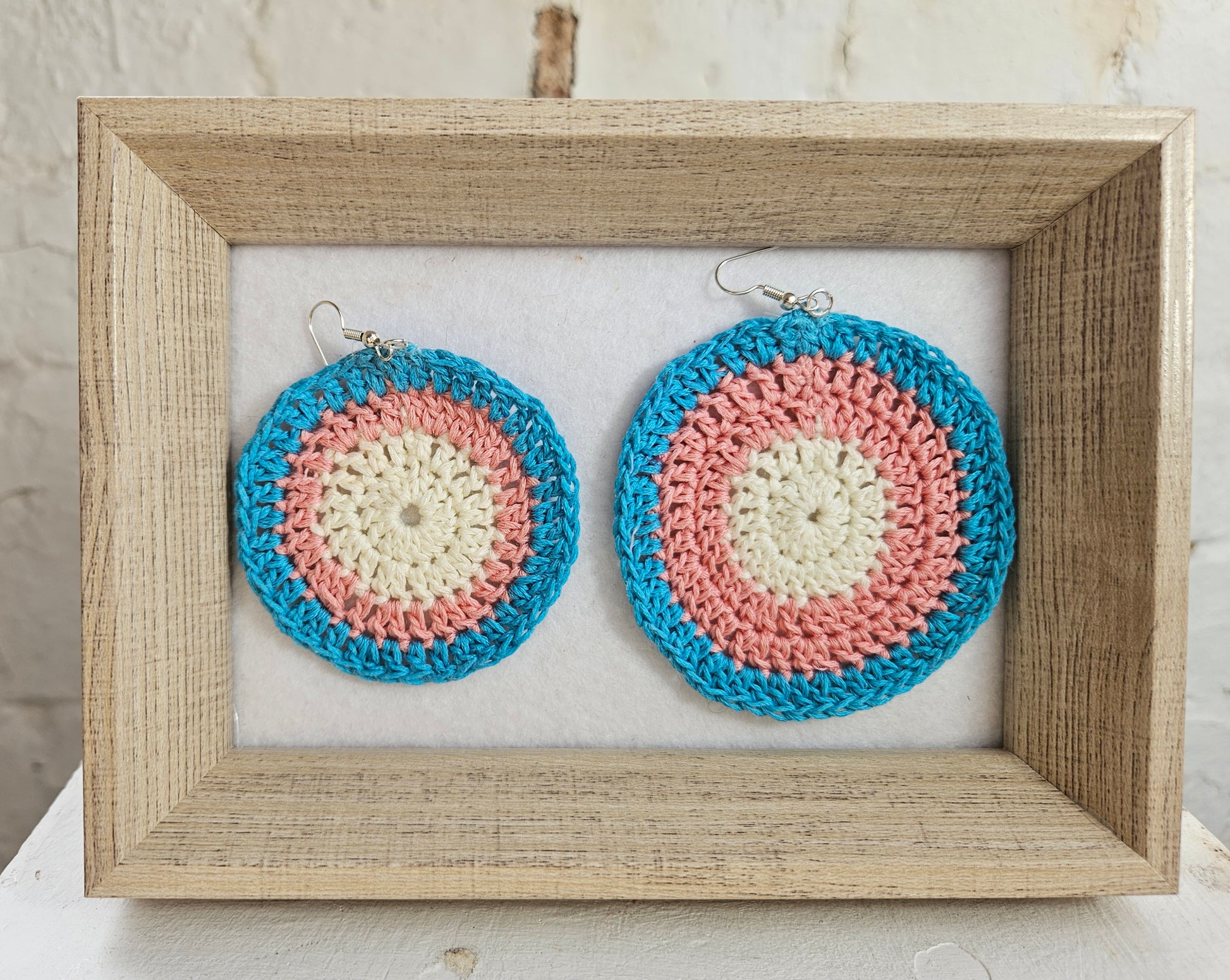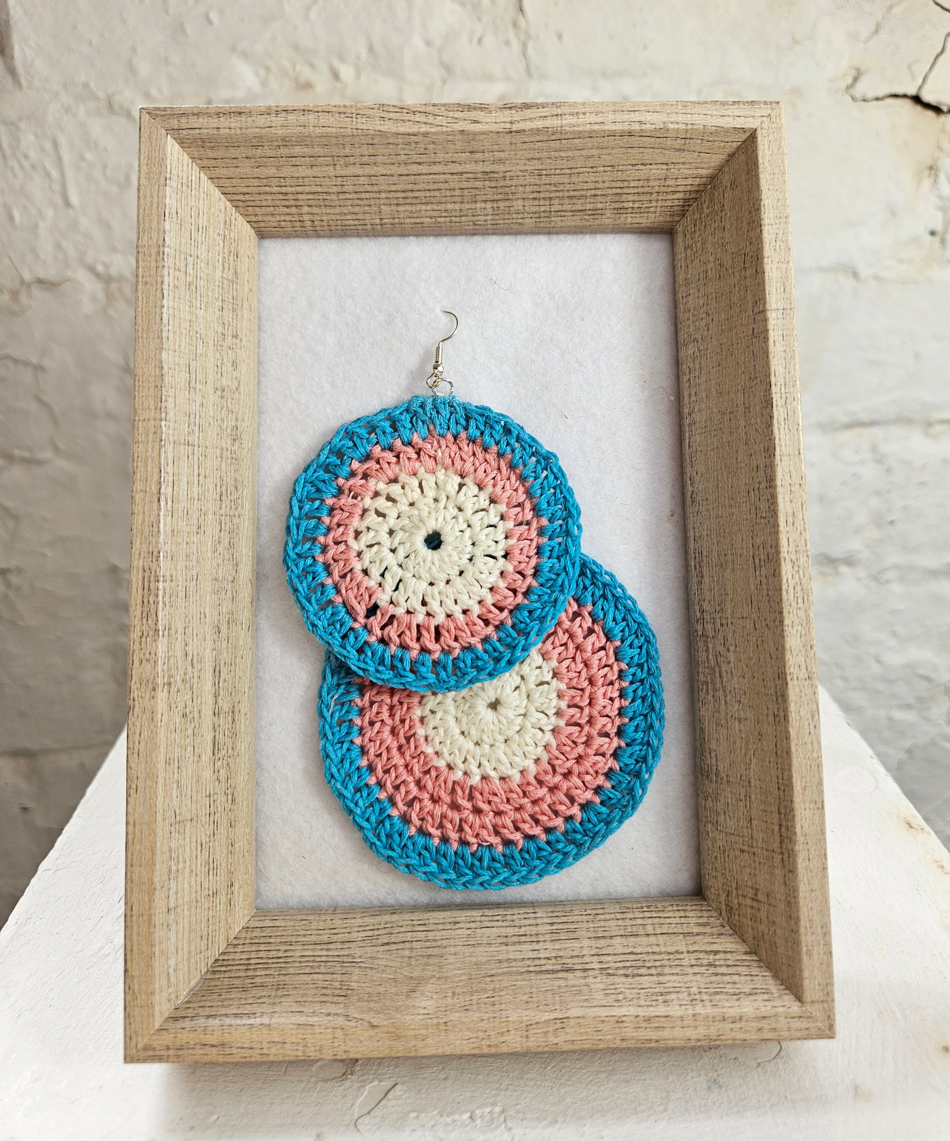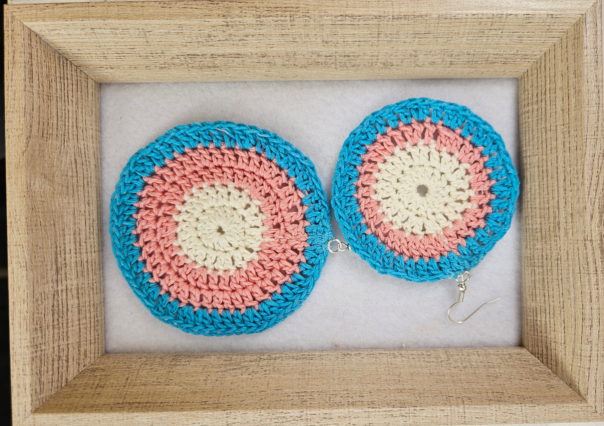 These earrings are a handcrafted crocheted piece.